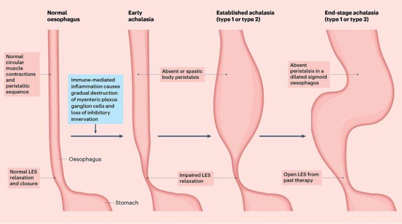 - • Achalasia occurs due to loss of inhibitory neurons.